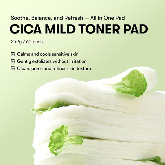 CICA Mild Toner Pad (60 Pads) - Exfoliating, Hydrating, Soothing, Ph Balancing with BHA, Centella Asiatica Extract, Hyaluronic Acids for Daily Facial Use
